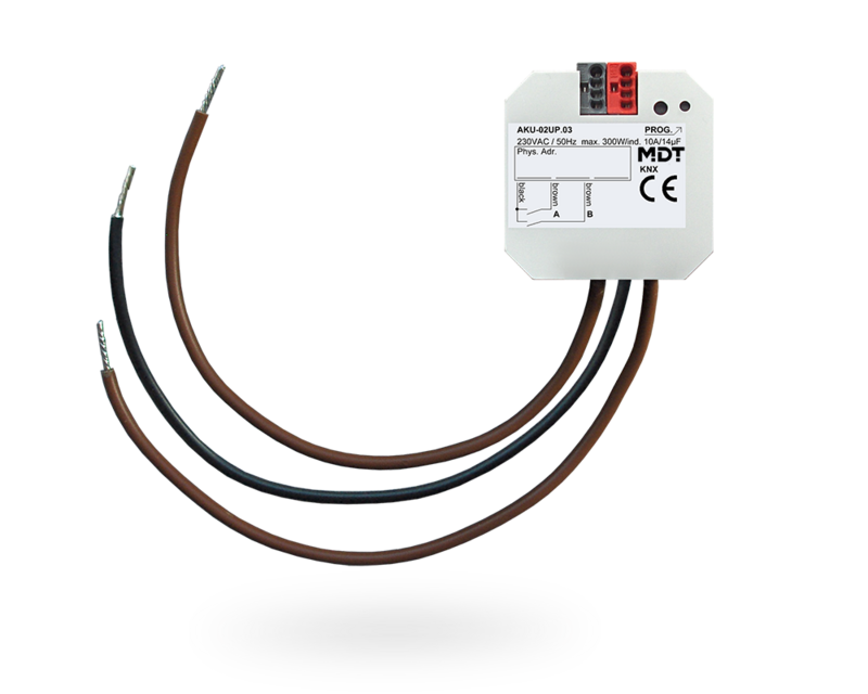 The flush-mounted version of the new Universal Actuator AKU can be used in a variety of ways: As a switch actuator with various functions (2-fold), as a shutter actuator (1-fold) with automatic shading function or as a heating actuator. The versatile application offers full functionality in all three areas. Existing conventional shutter push-buttons or window contacts can be connected directly to the floating binary inputs and evaluated (AKU-B2UP.03 only).