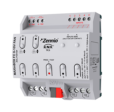 Kontroller kuni kahele 2- või 4-torulisele ventilaatorispiraalile, millel on sisse/välja klapid ja 0-10 V ventilaatori kiiruse juhtsignaal. Paigaldatud DIN-liistudele (4,5 tk). 4 multifunktsionaalset väljundit (16 A C-Load), mida saab kasutada ventilaatorispiraali sisse/välja klappide juhtimiseks või muuks otstarbeks. 4 analoog-digitaalset multifunktsionaalset sisendit, mida saab konfigureerida andurite ja potentsiaalivabade nuppude binaarseteks sisenditeks, temperatuurianduri sisenditeks või liikumisanduri sisenditeks. See sisaldab ka 2 termostaati ja 10 loogilist funktsiooni. Väljundite ja olekunäitajate käsitsi juhtimine LED-ide kaudu. Lisatarvikud: temperatuuriandur ja liikumisandur.