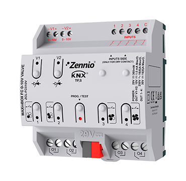 Kontroller ühele 2-toru- või 4-torulisele 0-10 V ventiilidega ventilaator-coil-seadmele. Selle 4 väljundit (16 A C-koormus) saab kasutada ventilaatori kiiruse reguleerimiseks või üksikute väljundidena. sellel on 4 analoog-digitaalset multifunktsionaalset sisendit, mida saab konfigureerida andurite ja potentsiaalivabade nuppude binaarseteks sisenditeks, temperatuurianduri sisenditeks või liikumisanduri sisenditeks. See sisaldab ka 2 termostaati, 10 loogilist funktsiooni ja võimaldab väljundeid käsitsi juhtida koos olekunäitega LED-ide kaudu. Kinnitus DIN-liistule (4,5 tk). Lisatarvikud: temperatuuriandur ja liikumisandur.