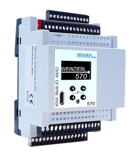 KNX TP Multi IO 570 (48I/O) on universaalne kahendliides hoone juhtimiseks. See pakub 48 I/O liini. Iga rida saab kasutada nii binaarsisendi kui ka binaarväljundina. Välisseadmeid saab toita välispingega 24 V⎓. Sisenditena konfigureeritud kanaleid saab kasutada tulede või ruloode juhtimiseks KNX võrgu kaudu. Neid saab kasutada ka impulsside loendamiseks, nt energiaarvestite liidesena. Väljunditena konfigureeritud kanalid võivad juhtida otse signaali LED-e, väliseid sidestusreleesid (nt Multi IO Extension Switch 590) või jalousie releesid (Multi IO Extension Switch 592). Integreeritud USB-liides võimaldab luua kahesuunalise ühenduse arvuti ja KNX siini vahel. USB-pistik on galvaaniliselt eraldatud KNX siinist. Seda liidest toetavad nii ETS (versioon 4.2 või uuem) kui ka visualiseerimistööriistad. Seadme seadistamine toimub ETS-iga, võimalik on kohalik allalaadimine. Esipaneelil olev hõlpsasti loetav OLED-ekraan võimaldab installimist testida käsitsi.